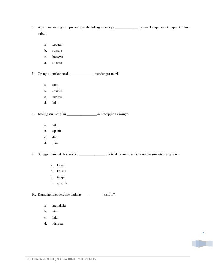 Bahasa Melayu Tahun 2. Kuiz bagi tahun 6 ini boleh dijadikan bahan ulangkaji untuk murid semasa cuti dan persediaan menghadapi UPSR yang akan datang. D seperti anjing dengan kucin.